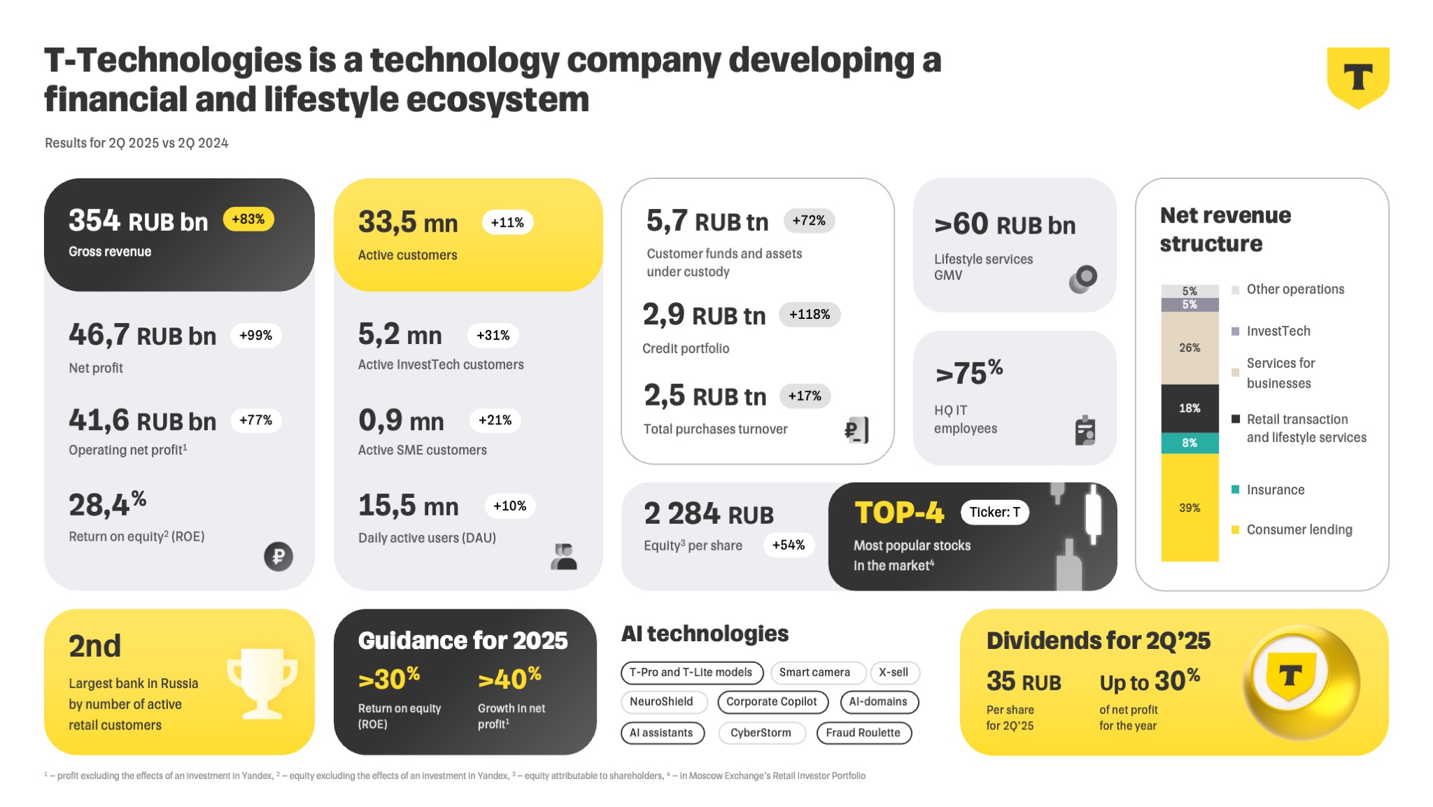 «The T ecosystem’s customer base and its transactional activity continue to grow: we are now serving over 51 mn customers, who, over the past six months, made purchases totalling over RUB 4.7 tn and entrusted us with RUB 5.7 tn. While our shares in key markets - in savings and loan portfolios, in both B2C and B2B - continue to grow, we still have significant potential to further grow and scale our business.
